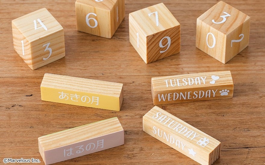 木目のわかる自然素材を使用した、ブロックカレンダー付きの卓上クロック。